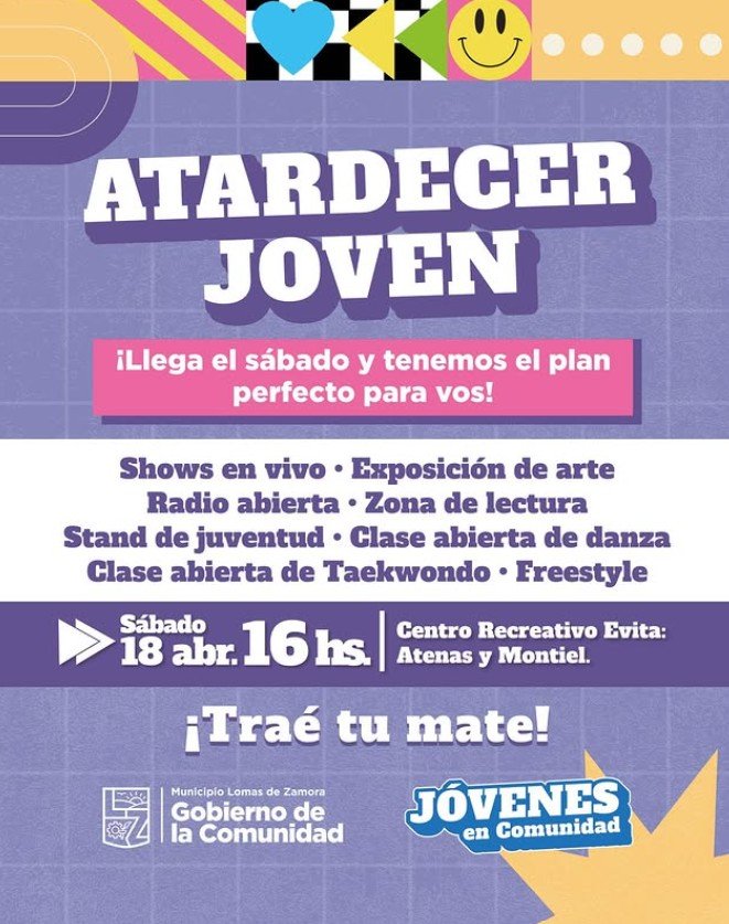 Este sábado 18 de abril, el Centro Recreativo Evita, ubicado en Atenas y Montiel, será el escenario de una jornada que arrancará a las 16 horas con entrada libre y gratuita. La propuesta, organizada con el respaldo del Municipio de Lomas de Zamora y la subsecretaría de Juventud, busca convocar a vecinos de todas las edades para compartir un atardecer diferente.