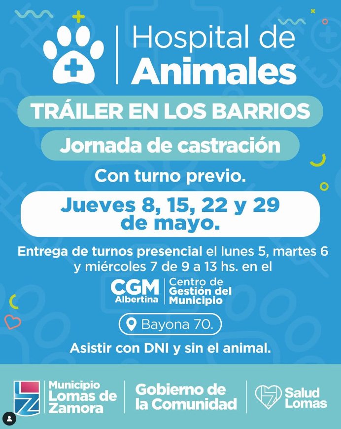 Para acceder a los turnos es necesario asistir previamente a la entrega presencial que se llevará a cabo en el mismo CGM los días lunes 5, martes 6 y miércoles 7 de mayo, entre las 9 y las 13 horas. Desde Salud Lomas y el Hospital de Animales remarcaron: “Es muy importante asistir a la entrega de turnos con DNI y sin el animal”, ya que ese paso es obligatorio para poder acceder al procedimiento veterinario.