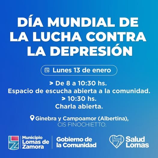 La Secretaría de Salud de Lomas de Zamora llevará a cabo una actividad especial el próximo lunes 13 de enero en el marco del Día Mundial de la Lucha contra la Depresión. El evento tendrá lugar en el Centro Integral de Salud (CIS) Finochietto, ubicado en Ginebra y Campoamor, Villa Albertina, y estará destinado a toda la comunidad interesada en trabajar sobre la importancia de la salud mental.